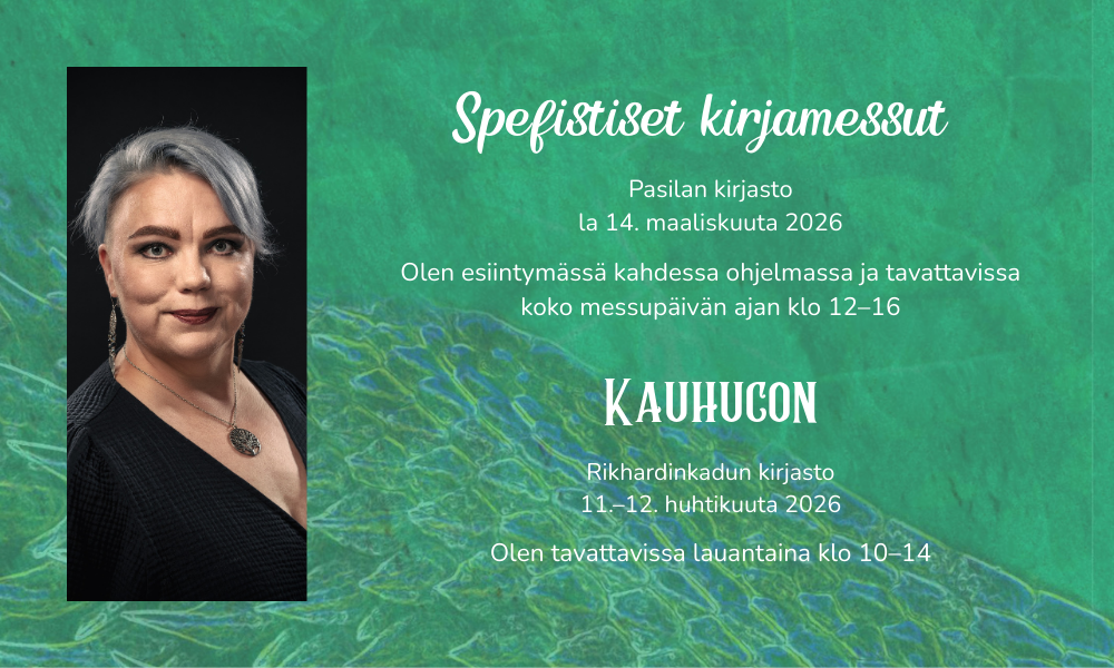 Kauhuconissa minulla ei ole tänä vuonna esiintymistä, mutta olen tavattavissa lauantaina klo 10–14 välillä. Tule rohkeasti nykäisemään hihasta.